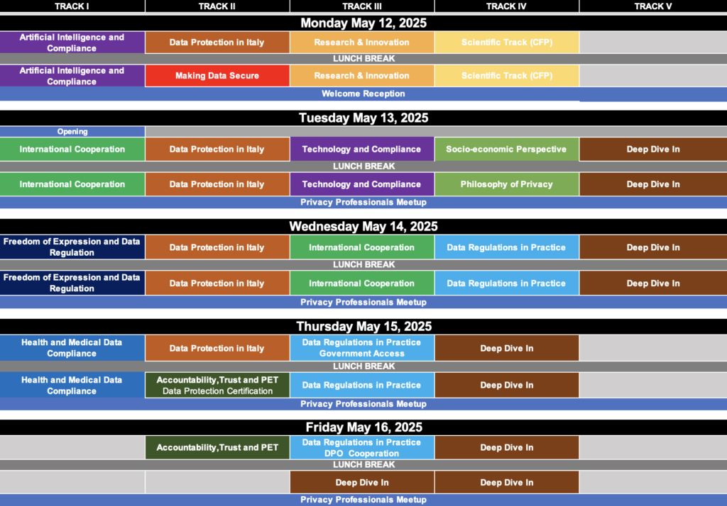Queste sessioni si svolgeranno in italiano. Il programma in italiano è coordinato dall’Istituto Italiano per la Privacy e la Valorizzazione dei Dati (IIP) in collaborazione con diverse organizzazioni italiane per la privacy e la protezione dei dati.
